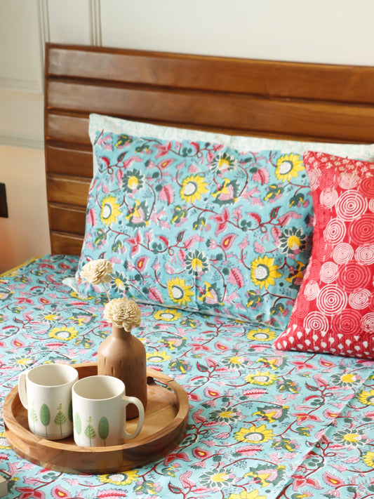 Kalamkari Pastel Blue – Flat I Fitted Bedsheet (90x108 Inches)
