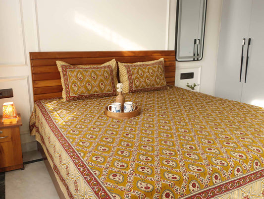Kalamkari Mustard Booti - Flat I Fitted Bedsheet (108x108 Inches)