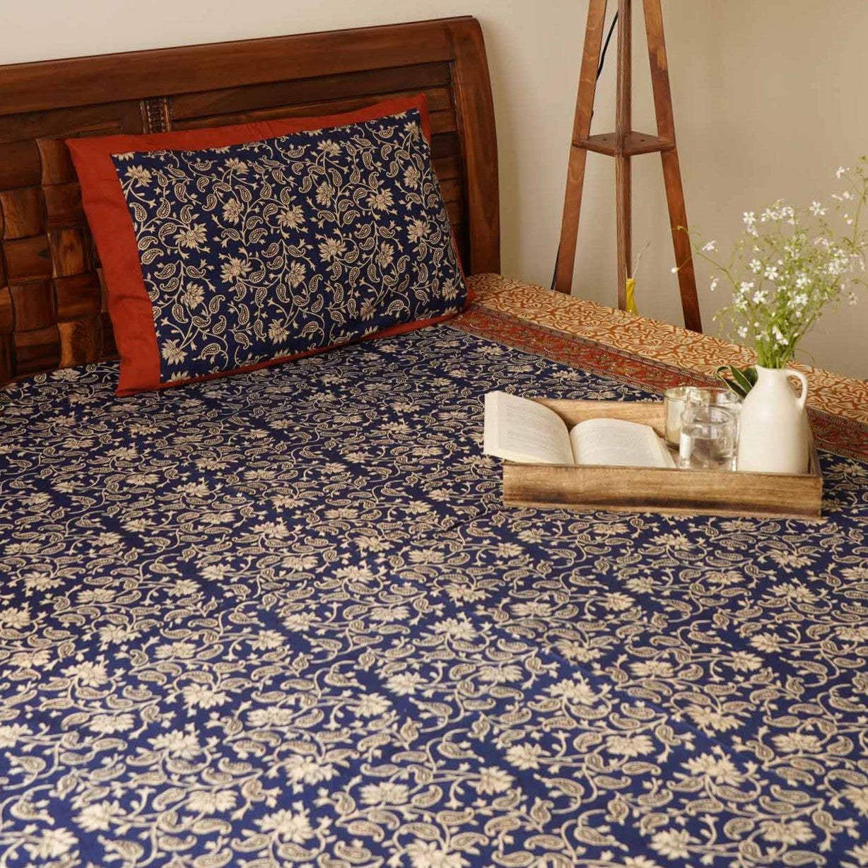 Blue Kalamkari - Flat I Fitted Bedsheet (90x108 Inches)