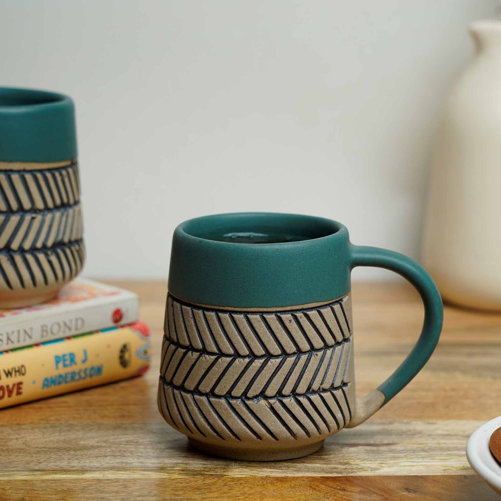 Say hii! to new mug in the house! Its matte, its earthy, its exactly what you need to add that ‘something new’ to monotonous morning coffee routine. Delicately hand-carved and given the shade of Sap Green with earthy tones, pick not just one but the set of 2 for you and your partner to have your leisure time together.