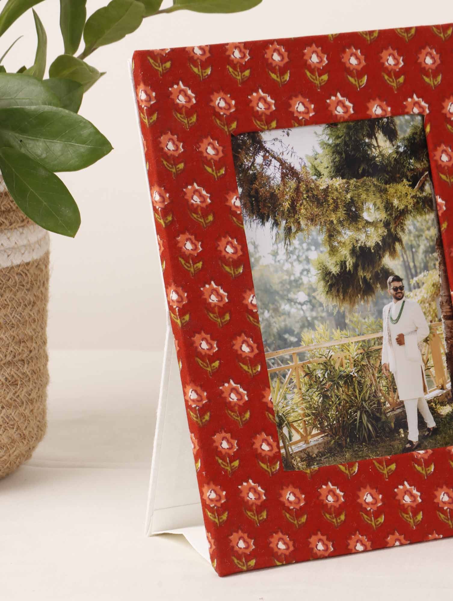 Capture your cherished memories with Local Kala's elegant photo frame, crafted from printed fabric and set on a sturdy cardboard base. Designed to beautifully complement any décor, this frame is perfect for displaying portrait pictures of size 4x6 inches. Its vibrant fabric design adds a unique touch of charm, making it a delightful addition to your home or a thoughtful gift for loved ones. Treasure your moments, framed in style!