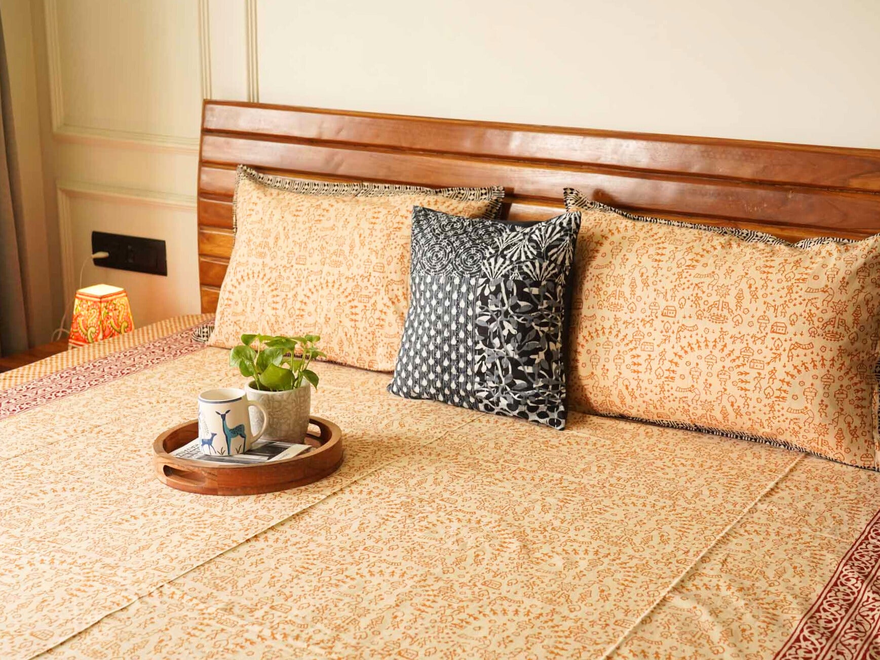 Hand Block Kalamkari Worli Mustard Bedsheet (90x108 Inches)
