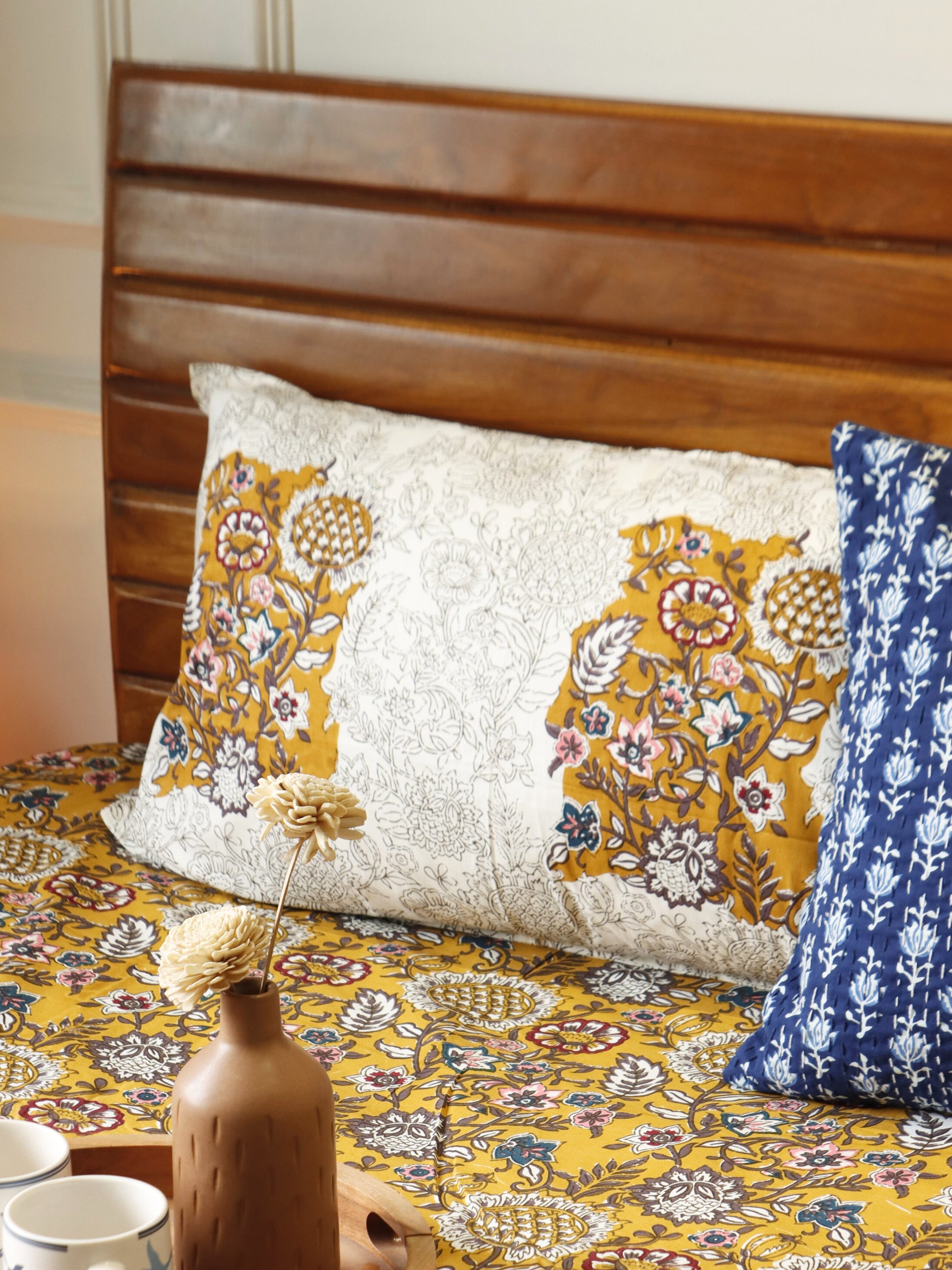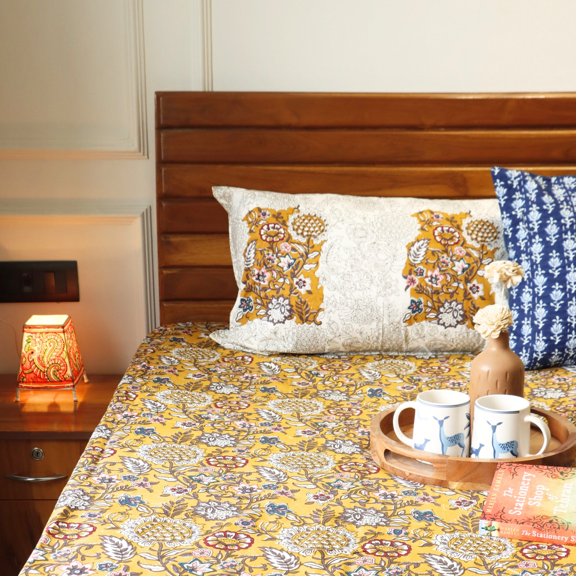 Kalamkari Chartlook Mustard - Flat I Fitted Bedsheet (108x108 Inches)